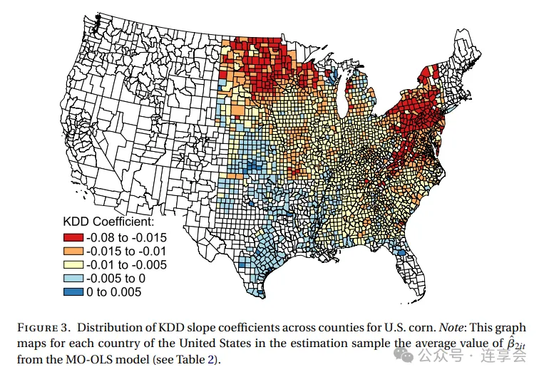 作者考察了玉米产量对热敏感性的地理格局,下图展示了样本中各县 KDD 系数平均值的分布情况。结果显示,敏感性最高的地区主要集中在北达科他州、南达科他州、明尼苏达州及美国东北部。玉米带大部分地区和东南部的敏感性范围在 -0.010 到 -0.005 之间,而敏感性较低的县则主要位于德克萨斯州、俄克拉荷马州和堪萨斯州。这表明,不同地区的热敏感性存在系统性差异:在温度较低的北部地区,谷物对高温的敏感性更强,而在温度较高的南部地区,谷物对高温的敏感性较弱,原因在于南部地区的农户和自然环境对高温的适应能力较强。
