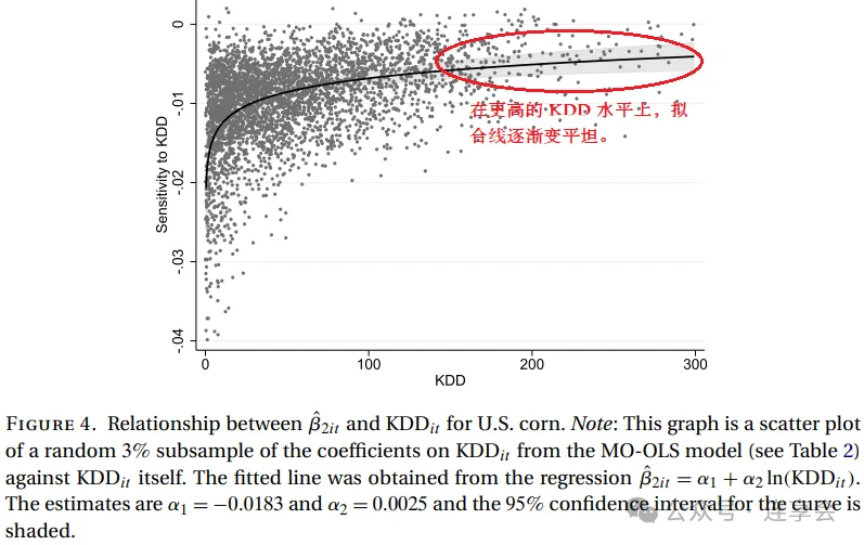 下图展示了 和 的散点图,以及 在 上的回归近似对数线性关系的最佳拟合曲线。结果显示,随着 KDD 的增加, 逐渐下降,表明玉米对高温的敏感性降低。这是因为在更高的 KDD 水平下,农户有更多动力提升适应性,从而降低玉米对高温的敏感性。
