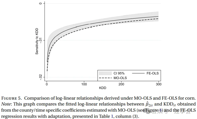 下图比较了 FE-OLS 和 MO-OLS 两种估计模型中 KDD 与系数 之间的关系。结果显示,MO-OLS 估计出的 绝对值较大,表明高温对谷物产量的负向影响更显著。然而,MO-OLS 估计曲线仍在 FE-OLS 估计曲线的 95% 置信区间内。