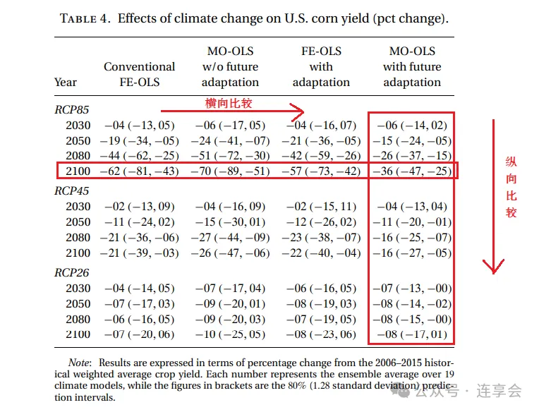 纵向来看,随着温室气体排放量的减少 (RCP85-RCP45-RCP26),KDD 的系数绝对值逐渐减小,适应性作用也随之减弱。以第二列和第四列为例,在 RCP85 排放路径下,到 2100 年,适应行为可减少 34% 的产量损失;在 RCP45 路径下,减少 10%;而在 RCP26 路径下,仅减少 2%。