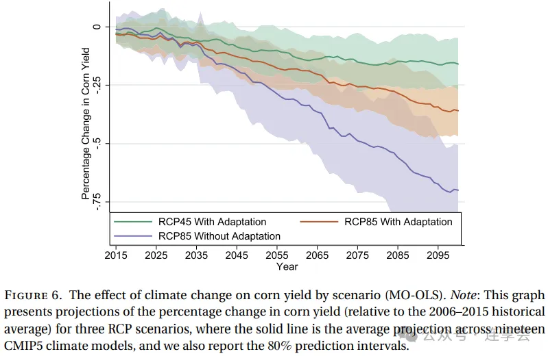 作者利用 19 种气候模型、3 条排放增长路径和 4 种计量模型,生成截至 2100 年的县级玉米产量综合预测,结果显示气候模型预测存在较大不确定性。如果仅依赖农业技术进步和对温度的适应性而未实施减排政策,玉米产量增长将远低于人口增长;而在农业技术进步的基础上,结合减排政策和适应性措施,玉米产量增长则有望与人口增长保持基本一致。
