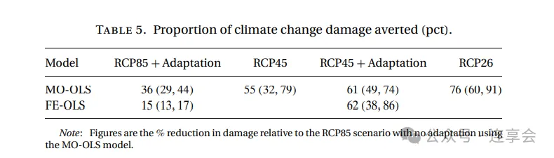 横向来看,1、2 列为不包含适应性的 FE-OLS 和 MO-OLS 估计结果。在 RCP85 的排放情景下,MO-OLS 估计结果显示截至 2100 年玉米平均产量将减少 70%,FE-OLS 结果显示截至 2100 年玉米平均产量减少将 62% 。这与前文提及的传统 FE-OLS 导致结果的低估相一致。第 3、4 列为包含适应行为的模型估计结果,与 1、2 列对比可以看出,适应性能够缓解气候变化对产量的负向影响。