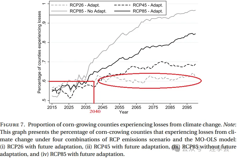 作者通过以下公式计算未来玉米产量的总损失,其中 为 RCP 排放增长路径, 表示是否采取适应行为,若采取则 = 1,若不采取则 = 0。