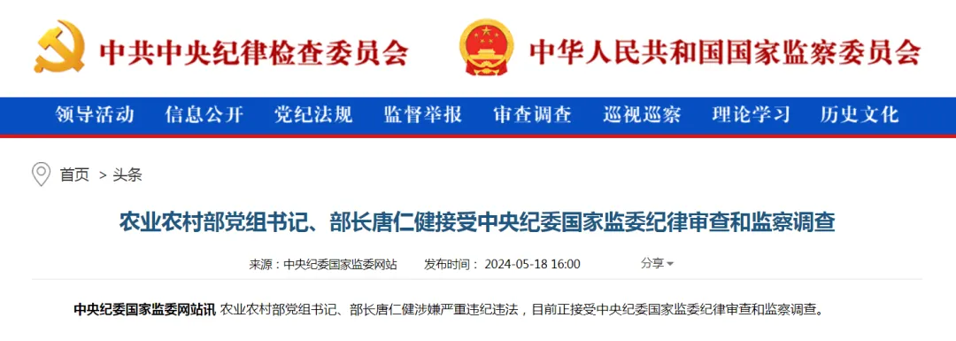 据中央纪委国家监委网站18日消息,农业农村部党组书记、部长唐仁健涉嫌严重违纪违法,目前正接受中央纪委国家监委纪律审查和监察调查。