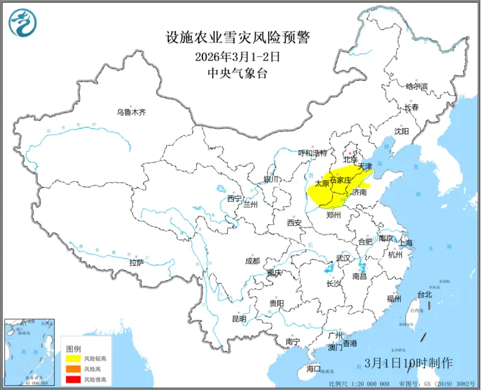 农业农村部和中国气象局联合发布设施农业雪灾风险预警:预计3月1日至2日,华北南部、黄淮西北部的部分地区有大到暴雪,将新增积雪深度3~8厘米,局地可达10~15厘米;山西中南部、河北中南部、河南北部、山东西北部等地设施农业雪灾风险较高,积雪可能导致设施温棚受损垮塌,造成棚内作物受灾。