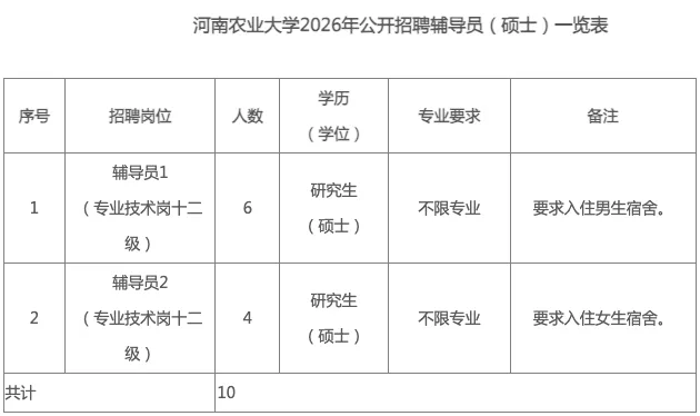 详见附件《河南农业大学2026年公开招聘辅导员(硕士)一览表》。
