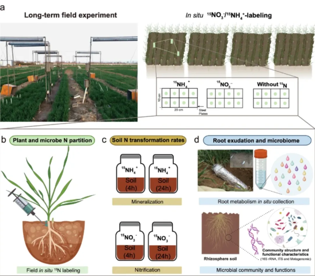 02 研究方案:研究人员基于一项为期10年的田间试验,探讨了实验性变暖和农业管理(保护性农业与传统农业)对小麦氮获取的交互影响。 该研究主要利用了原位 15N 标记技术、根系代谢组学以及微生物宏基因组学等手段进行深入分析。