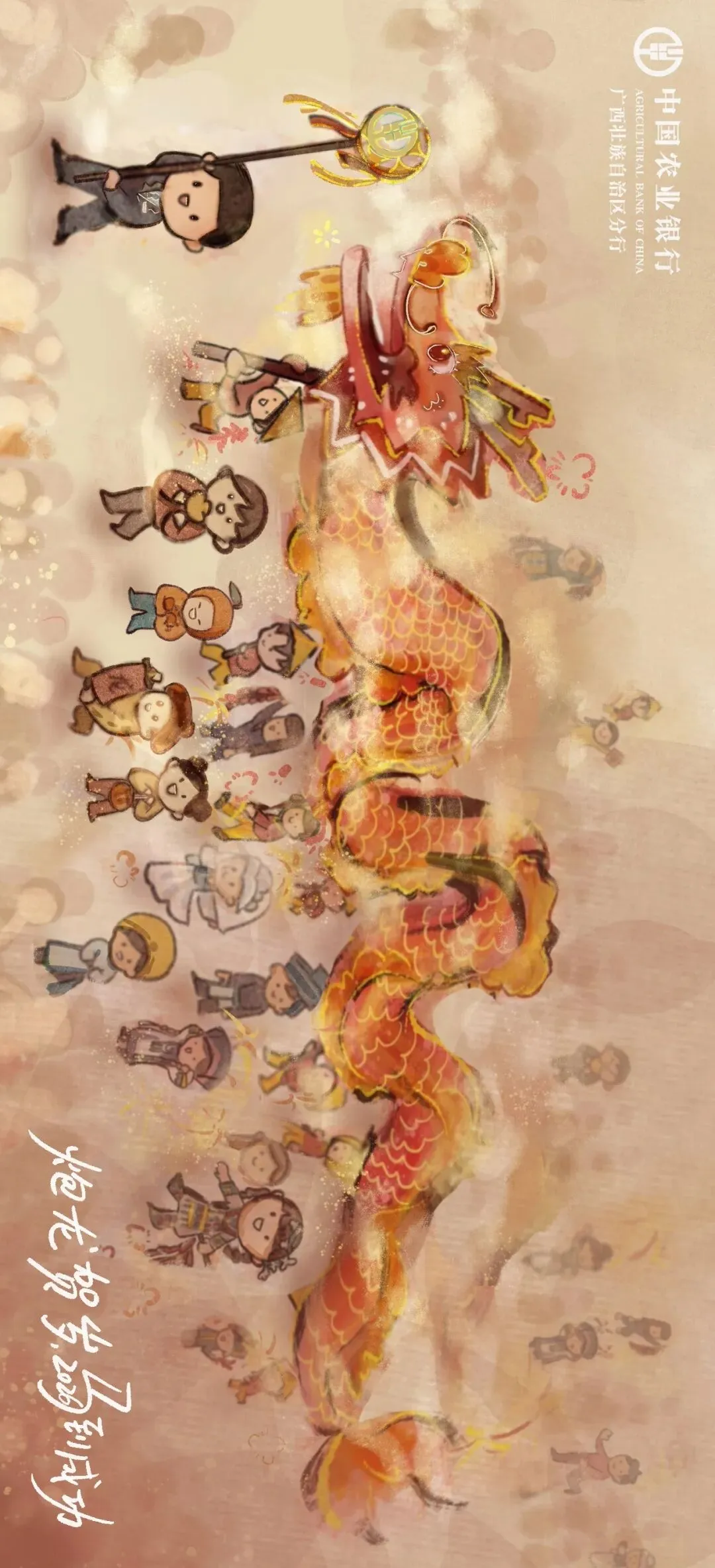 设计理念:自古以来,广西宾阳就有在新春舞龙的习俗。作品展现了农行客户经理和穿着各民族服饰的朋友们一舞炮龙醉元宵,揽火龙祥瑞之气,愿大家岁岁常安,事事如愿!