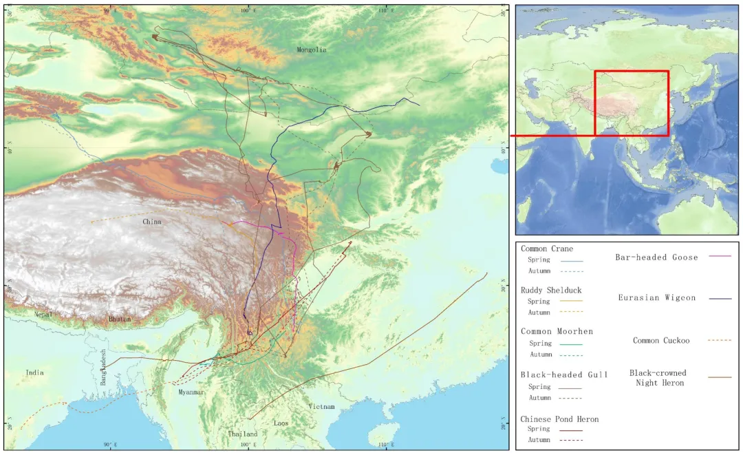 近日,河南农业大学王亚楠教授在《Advanced Science》期刊上发表题为“A genomic catalog of migratory microbiomes from wild birds across China’s habitats”的研究论文。河南农业大学动物医学院特聘教授王亚楠为论文唯一通讯作者,王亚楠与中科院昆明动物研究所伍和启为论文共同第一作者。该研究通过分析中国11个省份的近600份鸟类肠道微生物组数据(涵盖52个种、10个目),构建了跨境迁徙候鸟肠道微生物参考基因组和基因目录(简称MBGG),包含5823个宏(元)基因组装基因组(MAGs)、13072个质粒序列、44974个病毒基因组,结合精确的(GPS)定位跟踪系统,系统解码了迁徙候鸟肠道微生物的多样性、功能潜力及其在人兽共患病原菌、抗生素耐药性传播中的关键作用。研究团队整合分析52种鸟类的宏基因组测序数据,组装获得了5823个高质量MAGs,其中约50%的MAGs未被描述过,覆盖36个门、1709个潜在新物种,拓展了我们对候鸟携带“微生物暗物质”的认知。在功能基因挖掘方面,预测到15678个次级代谢产物生物合成基因簇(BGCs),其中核糖体合成肽类(RiPPs)和非核糖体肽合成酶类(NRPS)最为丰富,为新型抗菌肽和天然产物的开发提供了重要数据资源。研究团队在候鸟肠道微生物中识别出1814种抗生素耐药基因,绘制了52种鸟类的耐药基因图谱,包括碳青霉烯、多黏菌素、替加环素和恶唑烷酮等优先药物耐药基因,耐药基因的跨物种、跨区域(大洲、国家)、跨生境的传播风险严峻。研究团队为10种鸟类佩戴了GPS追踪器,累计获取超过10万个高精度定位点。