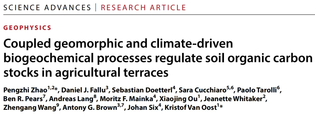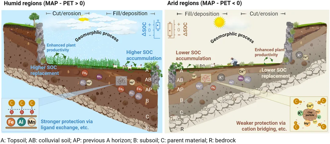 欢迎点击上方名片关注!推送等相关事宜直接后台私信即可!农业梯田是分布最广泛的人类建造地貌类型之一。它们深刻重塑了土壤景观并影响碳循环,但其影响的程度及驱动因素仍存在较大不确定性。通过整合沿气候—地球化学梯度分布的14个排水良好梯田地貌单元的野外观测数据与综合数据分析,我们发现,梯田修筑后土壤有机碳(SOC)储量的变化受两种耦合的碳周转—地貌过程控制:一是侵蚀部位流失表层土壤碳的补偿过程,二是沉积部位埋藏SOC的稳定化过程。气候通过塑造土壤地球化学特性和植物生产力,进而调控梯田内SOC的补偿与稳定化,从而显著调节这些过程。因此,梯田对SOC储量的影响在湿润地区表现为持续正效应,而在干旱地区则呈现正负并存的混合结果。本研究构建了阐释排水良好梯田系统中SOC动态的理论框架,并为在全球农业梯田中实施有针对性的碳汇提升管理策略提供了科学依据。Fig. 1.Terrace-induced changes in SOC stock (∆SOC) and its relationships with climates and geomorphic positions.
