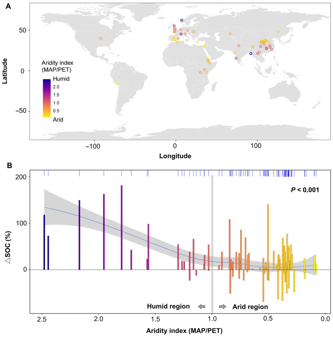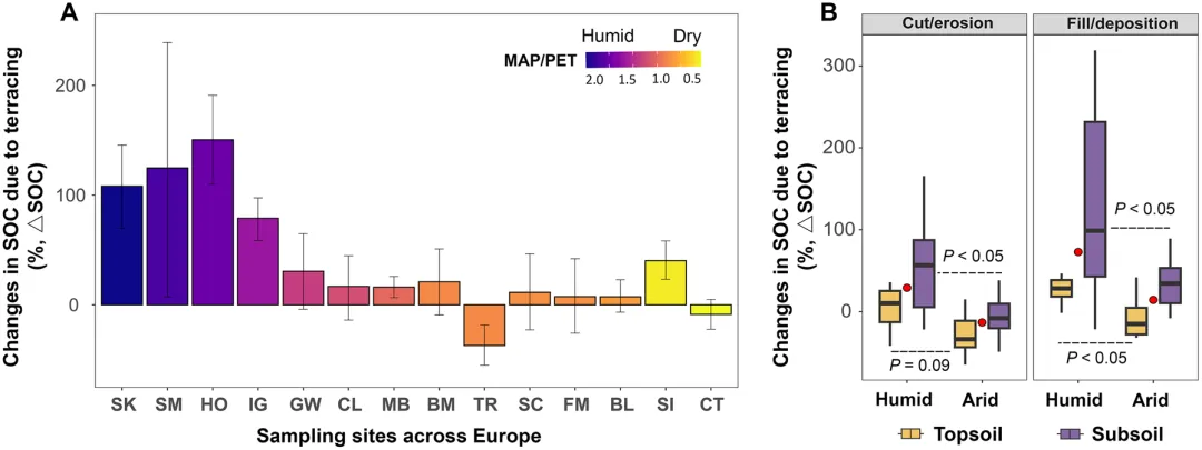 Fig. 2. Large-scale validation of the pronounced role of climate in explaining divergent SOC responses to terracing.