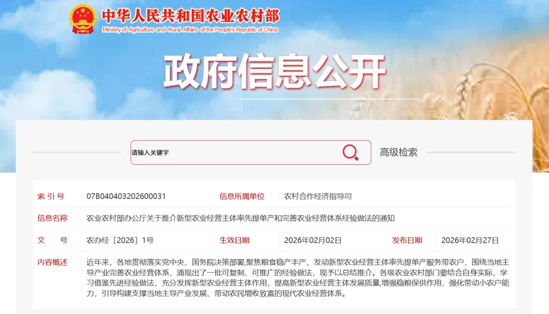 附件:农办经〔2026〕1号-农业农村部办公厅关于推介新型农业经营主体率先提单产和完善农业经营体系经验做法的通知.pdf