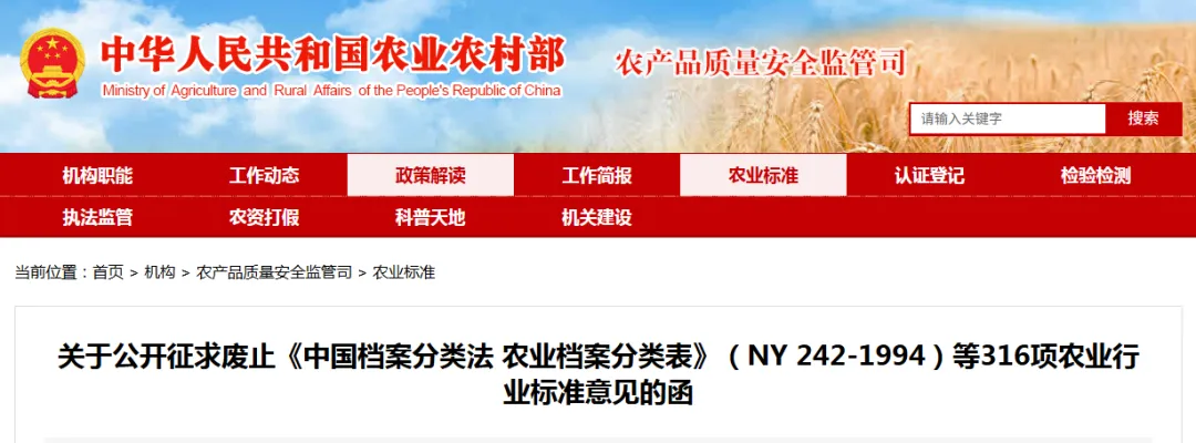 根据《标准化法》《行业标准管理办法》规定,农业农村部组织对实施5年以上的农业行业标准进行了复审。依据复审结论,经论证,农业农村部拟废止《中国档案分类法 农业档案分类表》(NY 242-1994)等316项农业行业标准(标准清单见附件)。现向社会公开征求意见,征求意见截止时间为2025年7月18日。