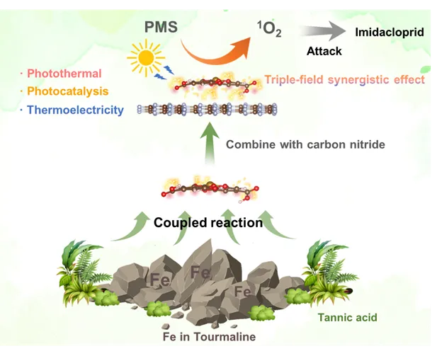 将光热、光催化、热电等多物理场耦合于高级氧化工艺中,可促进过一硫酸盐(PMS)的活化与污染物降解,但实现多场的协同耦合仍面临挑战。本文构建了由天然单宁酸(TA)、电气石(TR)与环境友好型氮化碳(CN)组成的三元复合体系(TTC),该体系通过界面相互作用成功实现了三场耦合。其中,TR作为热电材料,可通过光热激发产生电场;CN作为光催化剂,能够增强电场强度并优化电场分布;单宁酸‑铁(TA‑Fe)配位络合物则可提升光吸收与光热转化效率。该体系在15分钟内即可实现吡虫啉(IMI)100%降解,其主要活性物种为单线态氧(1O2),由TTC表面吸附氧物种(TTC‑O*)介导与PMS反应生成。机理研究表明,单线态氧可选择性进攻吡虫啉中的活性氮位点,生成氧化敏感性更高的中间体,最终实现快速矿化。本研究凸显了多场协同在高级氧化工艺中的重要价值,为基于天然矿物‑有机杂化体系的污染物去除提供了可持续策略。