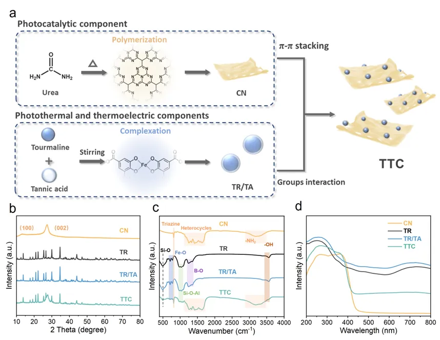 图1展示了TTC的合成过程及各组分间的相互作用。单宁酸与电气石中的铁离子配位螯合,形成具有优异光热性能的单宁−铁配合物;氮化碳通过水热法负载到体系上,实现了热电材料和光催化材料的有效整合。XRD和FT-IR分析证实了三种材料成功复合,DRS光谱显示TTC具有显著增强的光吸收能力,为后续的光催化活性提升奠定了基础。