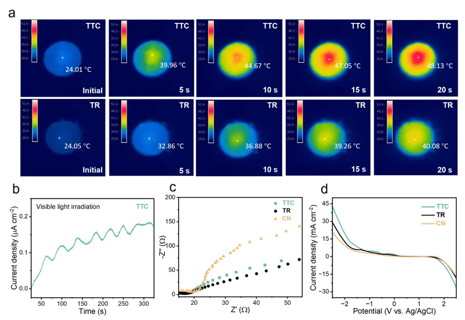 Fig. 2Photothermal and electrochemical properties of TTC. (a) Infrared thermal images of TTC and TR under visible light irradiation. (b) Steady-state current response of TTC under visible light irradiation. (c) EIS curves of samples. (d) LSV curves of samples.