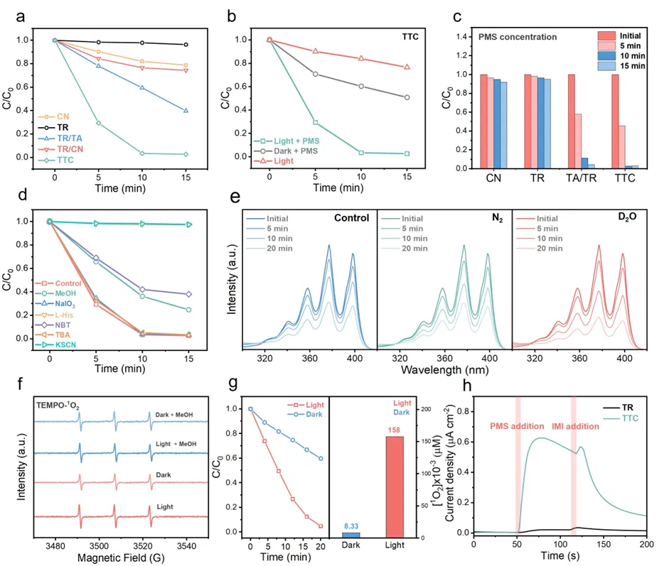 Fig. 3Degradation performance and mechanistic insights into TTC-PMS system. (a) Performance of different samples in activating PMS for IMI degradation. (IMI: 10 mg/L, catalyst: 0.4 g/L, PMS: 0.04 g/L, Xe lamp: 300 W visible light). (b) Performance of TTC in degrading IMI at different condition. (c) Concentration of PMS during IMI degradation by different catalysts. (d) Performance of TTC in activating PMS for IMI degradation in the presence of different quenchers (2 mM MeOH for and quenching, 1 mM NaIO3 for e-quenching, 2 mM L-His for 1O2 quenching, 2 mM TBA for OH quenching, 0.1 mM NBT for quenching, 1 mM KSCN for Fe reaction site quenching). (e) Changes in absorbance of DPA in the TTC-PMS reaction system under different conditions. (f) ESR spectra of TTC-PMS reaction system under different conditions. (g) Concentration variation of FFA in the TTC-PMS reaction system and the corresponding calculated steady-state concentration of 1O2. (h) i-t curves of TTC and TR as electrodes when PMS and IMI are added to the electrolyte solution (0.2 M Na2SO4) at different times.
