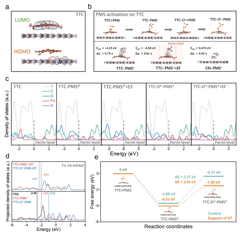 图4通过密度泛函理论(DFT)计算,从分子层面揭示了TTC激活PMS的机理:HOMO-LUMO分布显示TTC具有显著的空间分离,有利于定向电场分布和反应位点分离。PMS在TTC上的吸附表现出键特异性相互作用——当PMS以O-O键靠近TTC时,会自发形成TTC-O*、SO42-和H+;而以S-O键靠近时则保持常规吸附状态。电场(EF)能显著增强TTC对PMS的吸附能(从-4.23 eV增至-4.58 eV),优化态密度分布和d带中心位置。吉布斯自由能分析证实电场能降低PMS活化过程的能垒,促进反应顺利进行。DFT模拟完美印证了实验推测的PMS活化路径,揭示了电场在优化吸附、电子态和反应热力学中的关键作用。