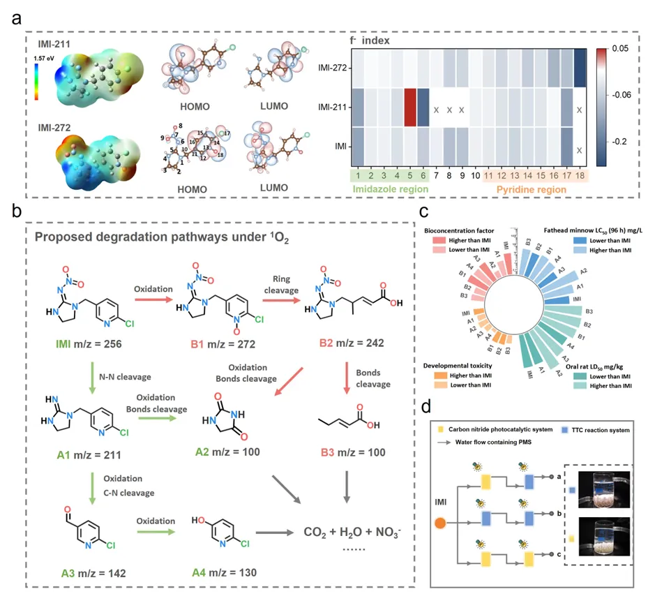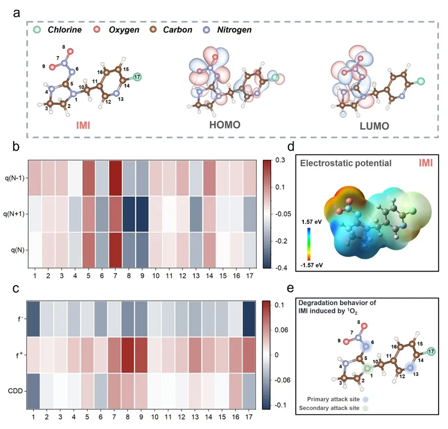 Fig. 5 Molecular reactivity and degradation pathways of IMI by ¹O₂ attack. (a) Molecular structure of IMI, along with the distribution of its HOMO and LUMO; red: oxygen atoms; silver: nitrogen atoms; brown: carbon atoms; green: chlorine atom. (b-c) Natural population charge distribution of IMI and the Fukui function index calculated therefrom. (d) Electrostatic potential energy distribution map visualized on the surface of IMI molecules. (e) Primary and secondary attack sites of IMI under the action of 1O2.
