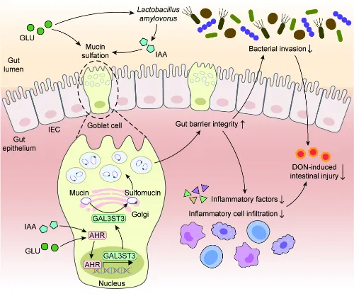针对饲料呕吐毒素污染普遍、危害严重的产业问题,该研究系统揭示了葡萄糖代谢产物——葡醛内酯通过微生物依赖与非依赖双重途径激活芳香烃受体AHR,促进黏蛋白硫酸化,从而缓解呕吐毒素所致仔猪肠道损伤的新机制。一方面,葡醛内酯通过重塑肠道菌群,增加益生菌Lactobacillus amylovorus及其代谢产物吲哚-3-乙酸丰度,以微生物依赖的方式激活AHR信号;另一方面,葡醛内酯能够直接与猪AHR蛋白结合并促进其核易位,以不依赖微生物的方式激活该通路。激活的AHR上调硫酸转移酶GAL3ST3的转录水平,驱动黏蛋白硫酸化进程,从而加固肠道黏液屏障,最终抵御呕吐毒素引起的仔猪肠道损伤。