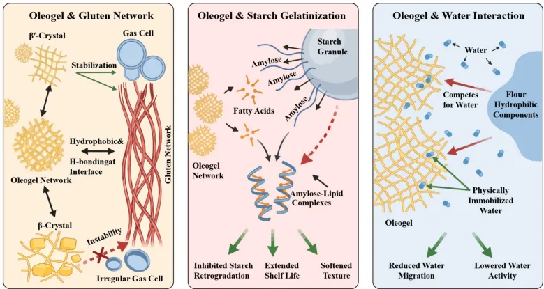 随着对健康面粉制品需求的增长,油凝胶化技术作为一种有前景的替代方案,通过将液态油构建成半固体结构,逐渐取代传统的塑性脂肪。本综述总结了塑性脂肪在蛋糕、面包和饼干等产品中的传统作用,并系统概述了油凝胶的结构化机制、制备方法、晶体构型及当前应用。特别关注了油凝胶晶体结构对其功能特性和产品性能的影响。尽管油凝胶可以减少不健康脂肪含量,并提高空气保持能力和氧化稳定性,但其可能减弱风味和改变口感的特性限制了其作为全脂替代品的应用。目前,在油凝胶与蛋白质和淀粉的相互作用、消化性及感官影响方面仍存在关键的知识缺口。未来的研究应聚焦于阐明油凝胶晶体形态和类型对面粉制品性能的影响,为开发新一代营养强化且高效的塑性脂肪替代品提供新见解。