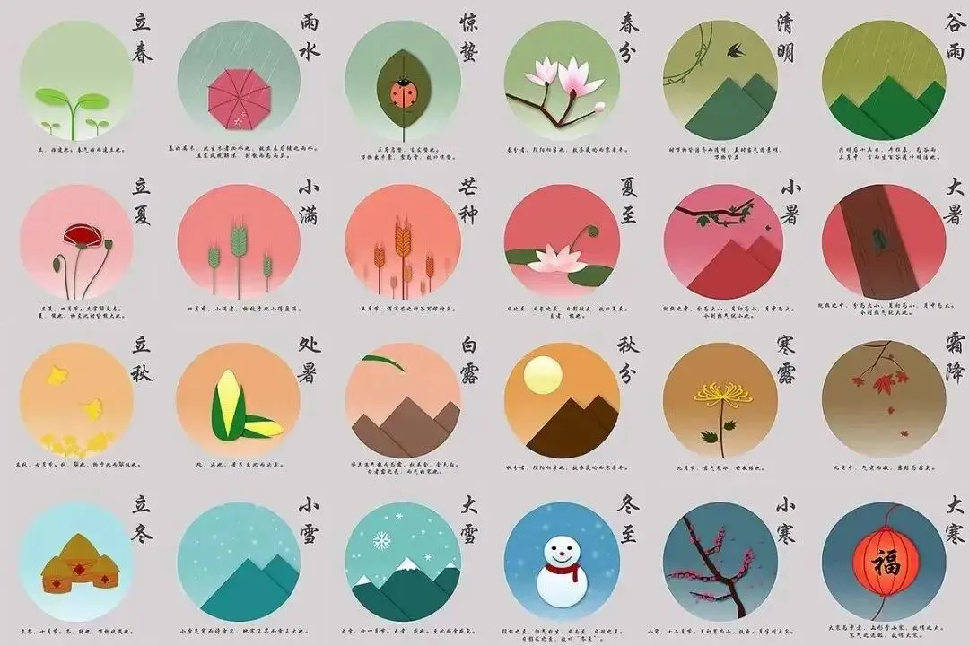 根据气候的变化,一年中有立春、雨水、惊蛰、春分、清明、谷雨;立夏、小满、芒种、夏至、小暑、大暑;立秋、处暑、白露、秋分、寒露、霜降;立冬、小雪、大雪、冬至、小寒、大寒。