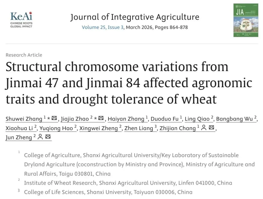 Shuwei Zhang, Jiajia Zhao, Haiyan Zhang, Duoduo Fu, Ling Qiao, Bangbang Wu, Xiaohua Li, Yuqiong Hao, Xingwei Zheng, Zhen Liang, Zhijian Chang, Jun Zheng. 2026. Structural chromosome variations from Jinmai 47 and Jinmai 84 affected agronomic traits and drought tolerance of wheat. Journal of Integrative Agriculture, 25(3): 864-878.