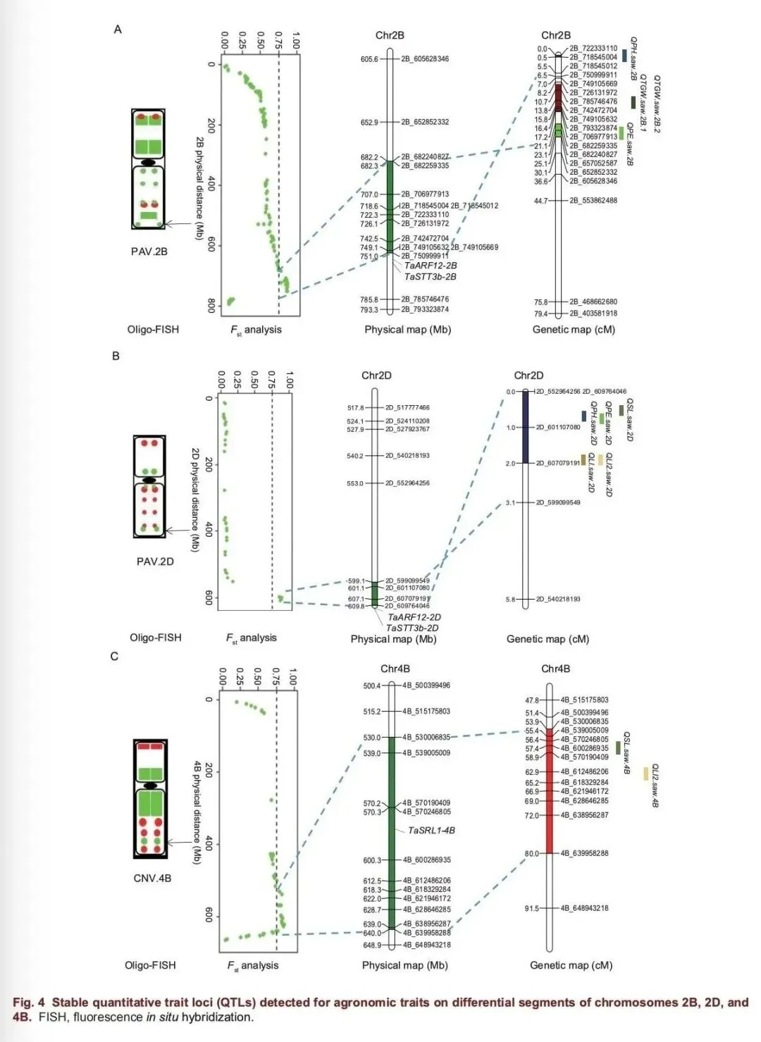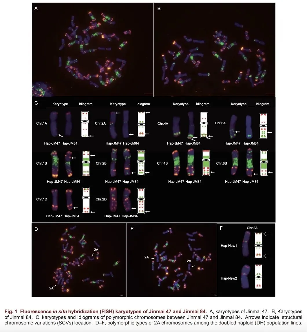 据此,山西农业大学小麦研究所分子育种课题组利用荧光原位杂交(FISH)技术,对山西小麦知名品种“晋麦47”与“晋麦84”及其衍生的DH群体进行染色体结构变异鉴定与遗传效应解析。