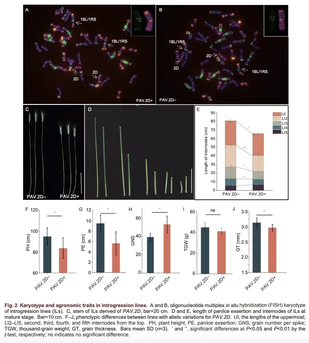 “晋麦47”是九五期间审定的省审、国审旱地小麦品种,具有抗旱高产稳产特性;自审定至今近30年一直作为国家黄淮流域、山西省、陕西省旱地区试对照品种,累计推广2亿亩以上。该研究发现“晋麦47”与“晋麦84”之间存在12个染色体结构变异,包括1个简单易位(1BL/1RS)、10个PAVs(present/absent variations )和1个CNV(copy number variation ),分布于10条染色体上。通过性状关联分析,共鉴定到8个SCVs与15个重要农艺性状显著相关,其中,2A染色体上检测到与穗粒数相关的PAV重组事件;来自晋麦84的1BL/1RS易位和PAV.2D分别通过调控基部第1-4节间和第2-4节间发育,显著降低株高,且PAV.2D可使穗粒数提升3.13%。随后又利用山西小麦种质验证了PAV. 4A、PAV. 6A和PAV. 6B等变异对粒长、穗长、千粒重等性状的遗传效应;整体发现染色体变异间存在加性和互作效应。