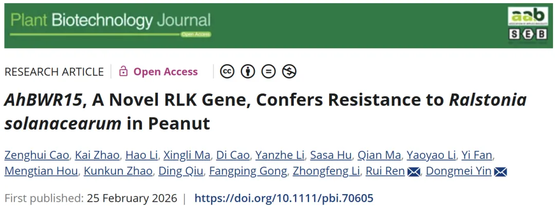 近日,河南农业大学殷冬梅教授团队在Plant Biotechnology Journal上发表了题为“AhBWR15, A Novel RLK Gene, Confers Resistance to Ralstonia solanacearum in Peanut”的研究成果,该研究在Chr15染色体精细定位到抗青枯病的关键基因AhBWR15,该基因能够通过激活脱落酸(ABA)信号通路来显著增强对青枯病的抗性,为培育抗青枯病花生品种提供了宝贵的遗传资源。