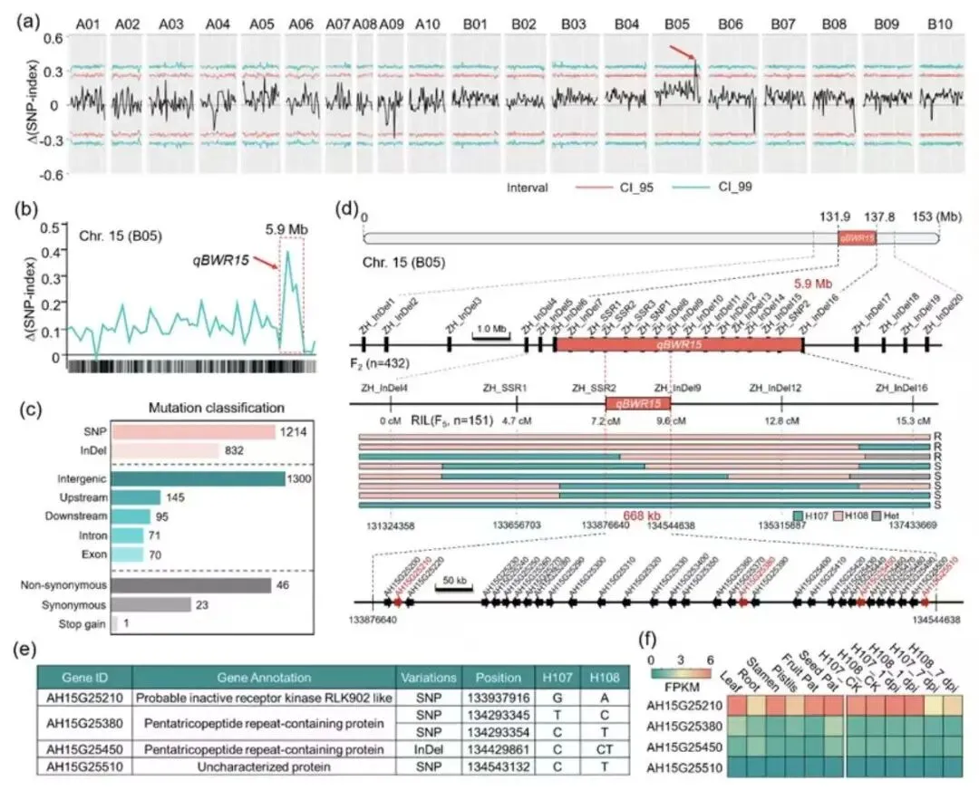 花生(Arachis hypogaea L.)是全球范围内最具重要性的油料和经济作物。青枯病(BW)是由青枯菌(Ralstonia solanacearum)引起的严重花生病害,导致花生种子质量下降以及严重的产量损失(50%-100%)。该研究选取殷冬梅教授培育的高抗青枯病品种“农大花 108”(H108)和易感品种“农大花 107”(H107)构建 F2群体(432 个单株),通过重测序和BSA分析,在 Chr15 号染色体131.98-137.77 Mb 区间定位到一个新的主效 QTL qBWR15,进一步开发分子标记将 qBWR15精细定位至668 kb 区域,其中编码亮氨酸受体激酶(LRR-RLK)的基因(命名为 AhBWR15)被确定为关键候选基因(图1)。