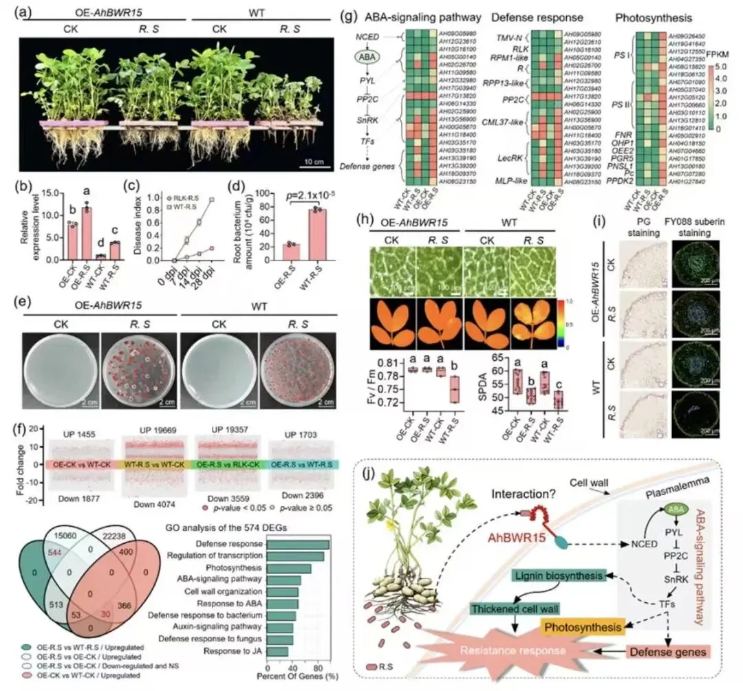 序列分析显示,AhBWR15 第一个外显子 1216 bp 处存在 G>A 非同义突变,导致第 618 位氨基酸由甘氨酸(G)替换为天冬氨酸(D),该位点位于跨膜结构域(TM)和丝氨酸/苏氨酸激酶结构域(STK)之间。对238 份花生自然种质资源的基因型检测表明,该突变仅存在于 H108 及其RIL中。单倍型分析显示,151 个RIL 群体中 64% 的抗病株系携带抗病单倍型(Hap-R),76% 的感病株系携带感病单倍型(Hap-S)。通过发根农杆菌介导的花生毛状根转化获得 AhBWR15 过表达植株,证明过表达 AhBWR15 能够显著提升花生青枯病抗性。进一步表达谱分析表明,AhBWR15 通过促进与脱落酸信号相关的防御反应以及维持细胞壁结构和高效的光合作用,使植株增强了抗青枯病的能力(图2)。