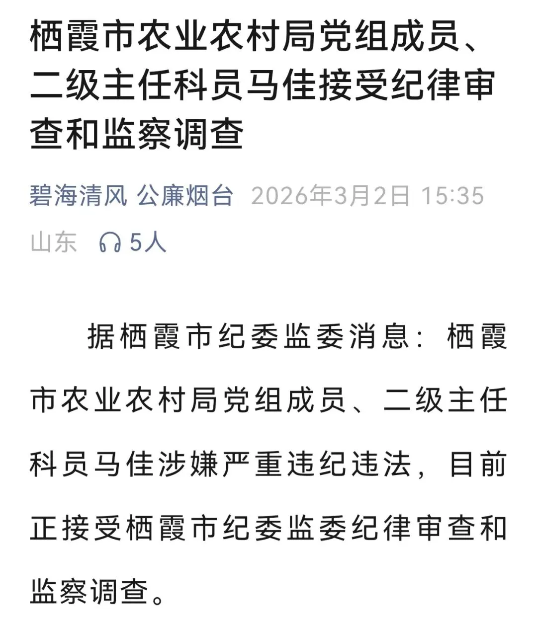 >山东烟台 马佳被查!现任栖霞市农业农村局二级主任科员,曾任乡村振兴局副局长