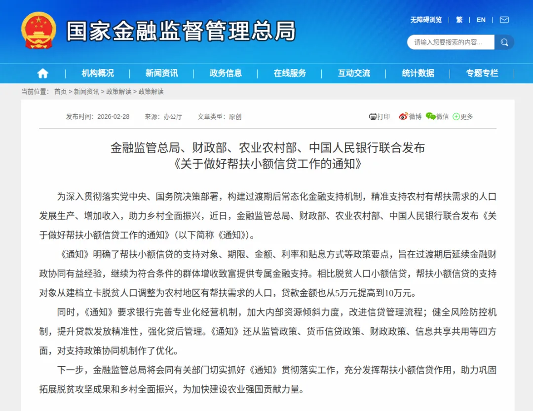 监管动态|金融监管总局、财政部、农业农村部、中国人民银行联合发布《关于做好帮扶小额信贷工作的通知》