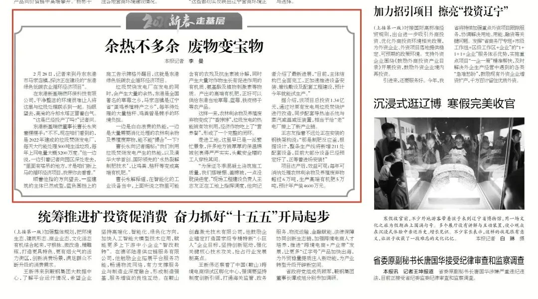 2月28日,《辽宁日报》二版刊发沈阳新基发展有限公司投资建设的“东港绿色低碳农业循环经济项目”。东港绿色低碳农业循环经济项目隶属新基发展所属东港新基瑞燃环保科技有限公司。目前,项目主体结构已全面完工,正加速推进设备安装、管线敷设及配套工程建设,预计今年可实现试生产。该项目通过改造原有发电用垃圾焚烧炉,同步配套导热油系统与蒸汽减温减压装置,为“老”电厂延伸出全新产业链。项目生产线将新增211处配套设备,目前大部分设备已完成预定,正陆续进场安装,其中就包括用于制肥的反应釜等关键设备。 该项目达产后效益可观,每年可消纳处理农林剩余物及养殖废弃物超过6万吨,生产固体、液体两大品类高端有机肥共5万吨,预计年产值约4600万元。该项目的落地投产,将为当地绿色农业循环经济发展提供全新优质解决方案,进一步推动生态保护与农业提质增效协同发展,为乡村振兴注入绿色动能。