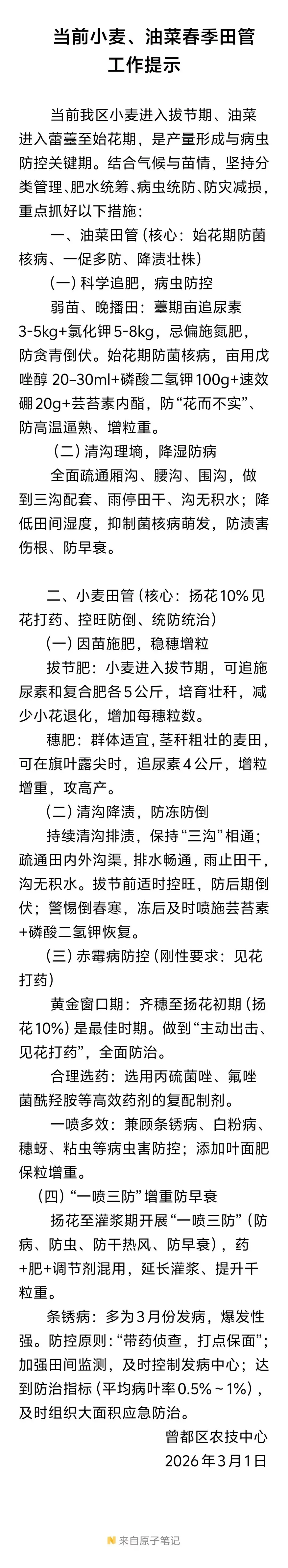 >『农业生产』当前小麦、油菜春季田管工作提示
