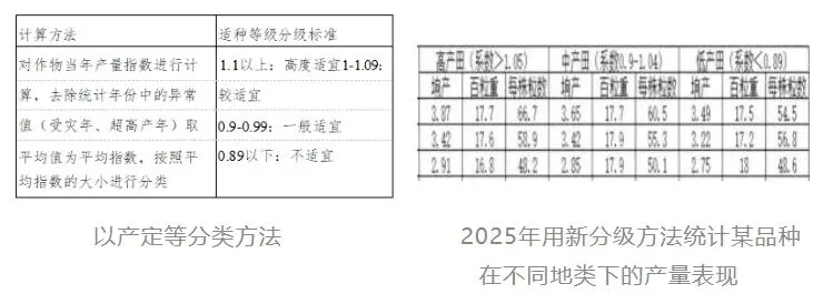 技术解决的主要问题是根据以往经验判断、跟风种植的不科学选种方法。通过收集全场各地号历史多年份的产量和籽粒水分数据,统计同品种各地号均产,用产量系数给地号赋值,每个年度均通过此方式赋值后即形成一个多年赋值数据组,去除极端年份(最高值、最低值)的系数值后计算整体均值,得到地号综合产量系数值,根据生产需要,将产量系数划定为几个区间,进而划定出高、中、低产田;在分类地号上进一步开展新品种产量差异分析,形成不同产量系数下的品种平均产量值,从中找到各品种的产量高值区间;在下一年度种植该品种验证结果的准确性。