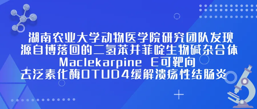 湖南农业大学动物医学院研究团队发现源自博落回的二氢苯并菲啶生物碱杂合体Maclekarpine E可靶向去泛素化酶OTUD4缓解溃疡性结肠炎