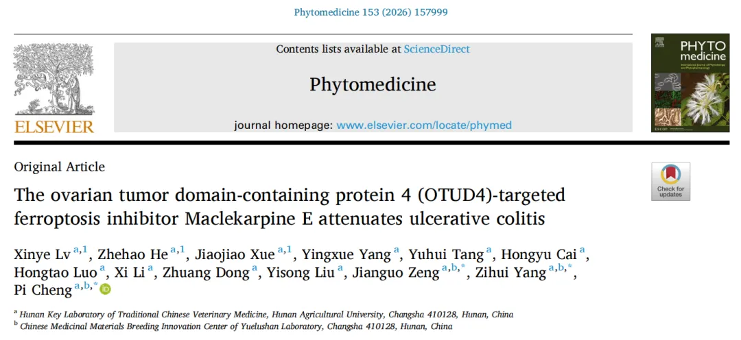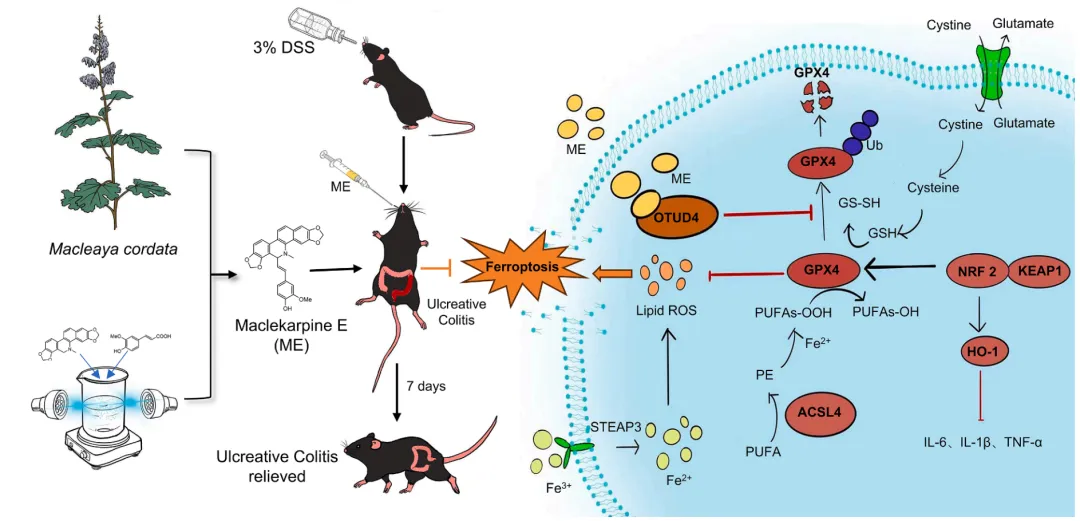 溃疡性结肠炎是一种常见的慢性肠道炎症性疾病,其发病机制复杂,现有治疗方法存在局限性。近日,湖南农业大学动物医学院、岳麓山实验室中药材品种创制中心曾建国、杨子辉、程辟团队在中科院一区top期刊《Phytomedicine》发表研究论文,报道了源自药用植物博落回的天然产物Maclekarpine E可通过靶向去泛素化酶OTUD4抑制铁死亡,从而缓解溃疡性结肠炎的作用机制。