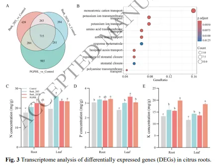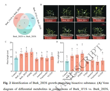 (3)转录组与离子组揭示养分调控机制:转录组分析表明,无论是接种Burk_2H3活菌、施用其无菌上清液,还是单独添加PGPHL,均一致性上调了根系中多个关键养分转运蛋白基因,包括氮、磷和钾转运相关基因。离子组学分析进一步验证,处理后根系中氮、磷和钾浓度显著升高,说明PGPHL通过激活植物养分吸收通路,增强矿质元素积累,从而促进生物量增加。