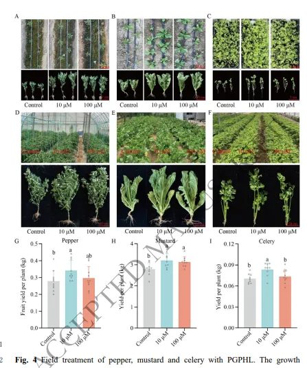 (4)田间验证显示广谱促生潜力:在田间试验中,PGPHL处理使辣椒生物量提高21%,芹菜提高15%,芥菜提高18%。这一结果表明,PGPHL的促生效应并非局限于柑橘,而在不同经济作物中均具有显著增产潜力。