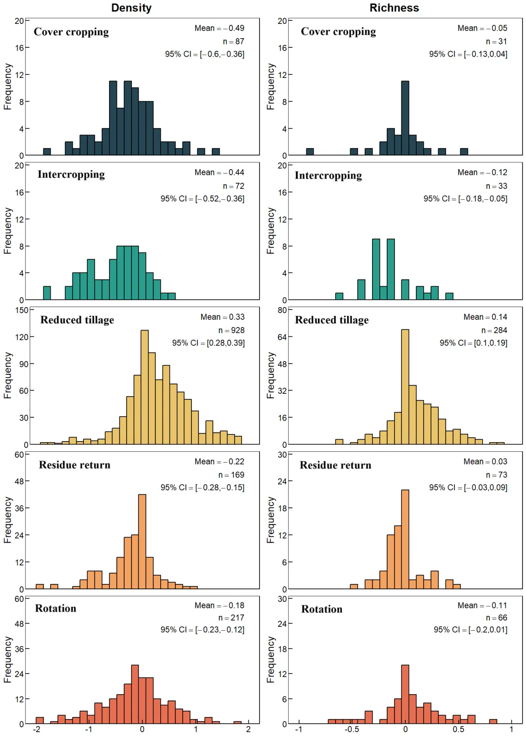 图1 可持续农业措施对杂草种子库效应值(LnRR)的频率分布