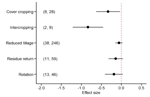 仅采用少耕会使得种子库密度和丰富度均显著增加,但额外引入其他可持续农业管理措施将能够抑制少耕对种子库的影响,且该效应将随着引入措施数量的增加而加强,最终可以消除少耕对杂草种子库的正向作用(图3)。