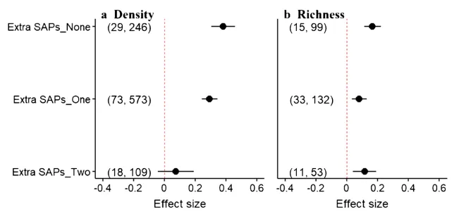 图3 少耕与其他措施组合对种子库密度和物种丰富度的影响(Extra SAPs_None, Extra SAPs_One, Extra SAPs_Two分别代表0、1、2种及以上可持续管理措施与少耕的处理组合)