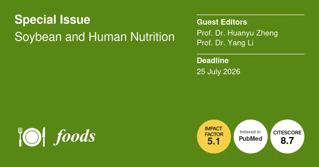 Foods 期刊特邀东北农业大学郑环宇教授和李杨教授共同创建特刊“Soybean and Human Nutrition (大豆与人类营养)”。本特刊旨在收集关于大豆加工技术创新与人类营养健康的高质量研究论文,以推动该领域的成果交流并促进相关技术的实际应用。特刊主题包括但不限于以下方面: