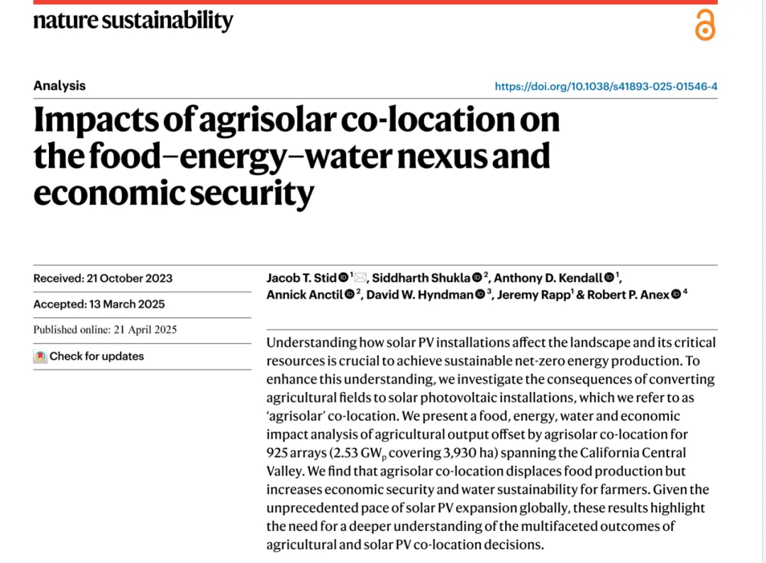 在全球能源转型背景下,太阳能光伏(PV)设施在农业用地的快速扩张引发了关键矛盾:如何在实现净零碳排放目标的同时,减少对农业生产、水资源和农民经济安全的负面影响?该研究聚焦加利福尼亚中央谷地(CCV),通过量化农业光伏共址对食物生产、能源产出、水资源利用及经济收益的综合影响,探索可持续能源与农业协同发展的路径。结果表明,农业光伏共址取代了粮食生产,但增加了农民的经济安全和水的可持续性。鉴于太阳能PV在全球范围内前所未有的扩张速度,这些结果突出了对农业和太阳能PV共同选址决策的多方面结果有更深入了解的必要性。