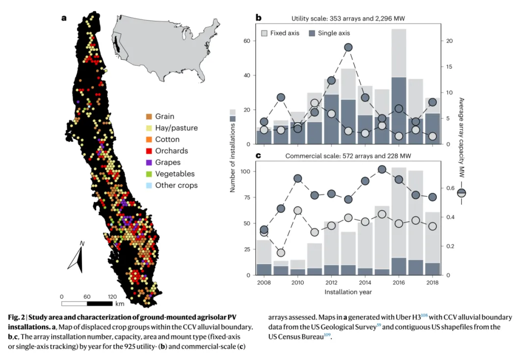 研究收集了截至2018年CCV内农业共同定位的太阳能PV装置的综合数据集,并确定了2008年至2018年期间安装的925个太阳能PV阵列。输入太阳能PV数据集的时间合成,按阵列规模分开(图2b,c)。较小的商业规模阵列大约是常见的两倍,但占公用事业规模阵列装机容量和转换土地面积的十分之一。商业规模的阵列主要是固定轴,而公用事业规模的阵列更常见的是单轴跟踪系统。2016年,两种阵列规模的安装数量也出现了显著的高峰。虽然转换作物类型存在一些空间聚类(图2a),但转换作物广泛分布在整个CCV中。