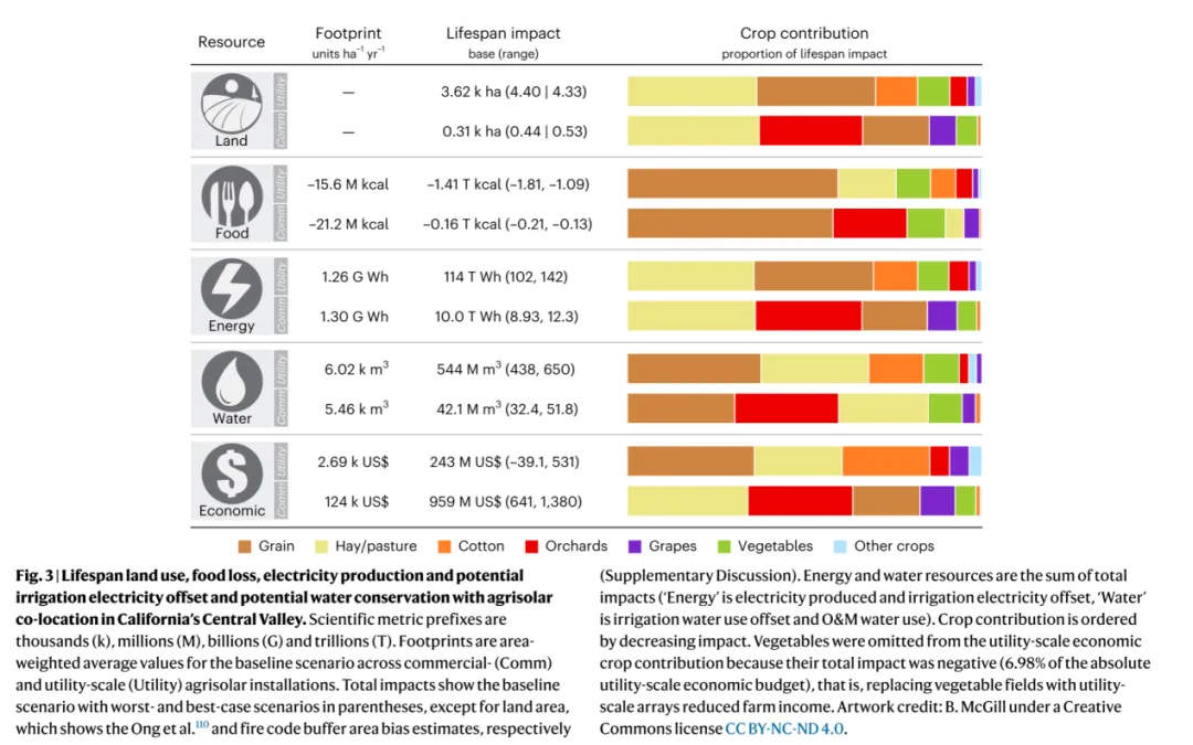 74%的光伏阵列替代了灌溉农田,节水量为运维用水量的8倍。在一切照常的总用水量预算变化的基础上,估计该地区的农业光伏共址可以为2700万人提供饮用水或灌溉3000公顷的果园25年。58个公用事业规模阵列周边968公顷的农田休耕,推测年节水量增加1.2亿立方米。对抵消灌溉用水贡献最大的灌溉作物是商业规模设施的果园(29%)、干草/牧场(28%)和谷物(27%),以及公用事业规模设施的谷物(37%)、干草/牧场(31%)、棉花(15%)。