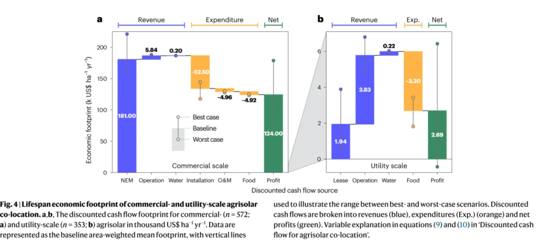 无论土地所有者如何获得补偿,相邻的农业太阳能共置比仅用于农业的基线方案更有利可图(图4)。对于商业规模的阵列,初期投资高(5.3万美元/公顷),但NEM政策下5.2年回本,通过抵消电力成本和剩余发电卖回电网的方法,净收益达12.4万美元/公顷/年,比损失的粮食收入高25倍。公用事业规模的农业太阳能土地所有者的净经济足迹比商业规模的足迹少46倍(图4b)。与商业规模的太阳能电池板相比,公用事业规模的农业太阳能土地所有者不负责安装或运维成本,只通过土地租赁和抵消运营和灌溉用水成本得到补偿,部分案例可能会亏损。