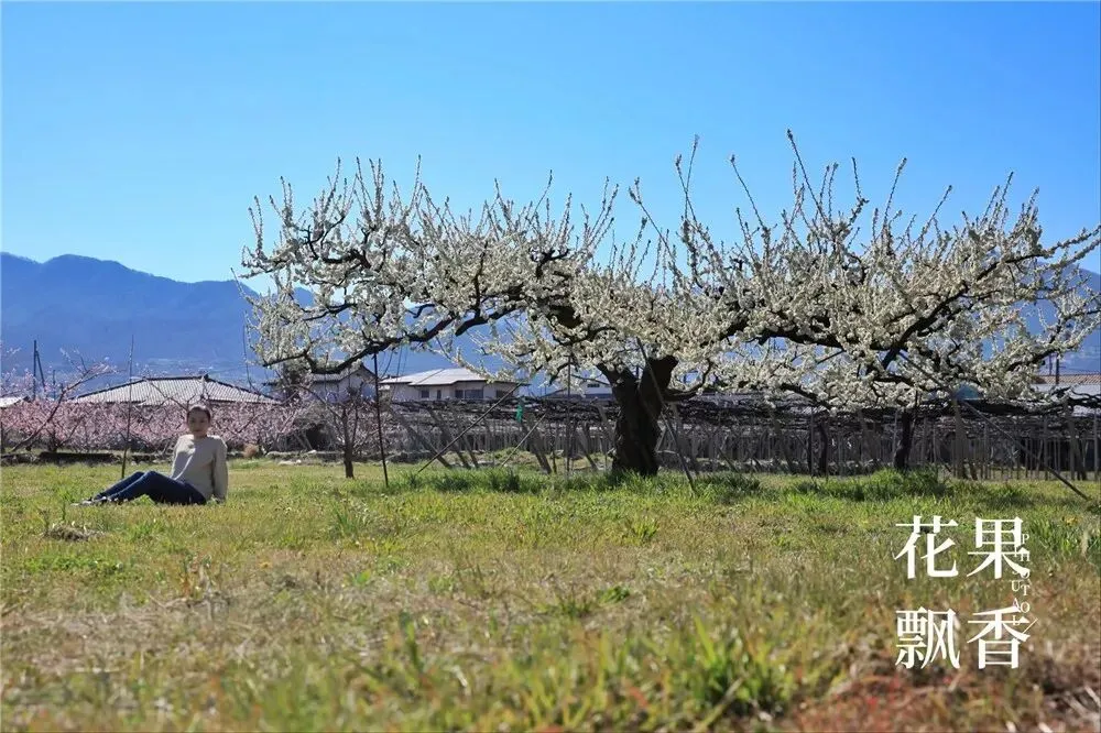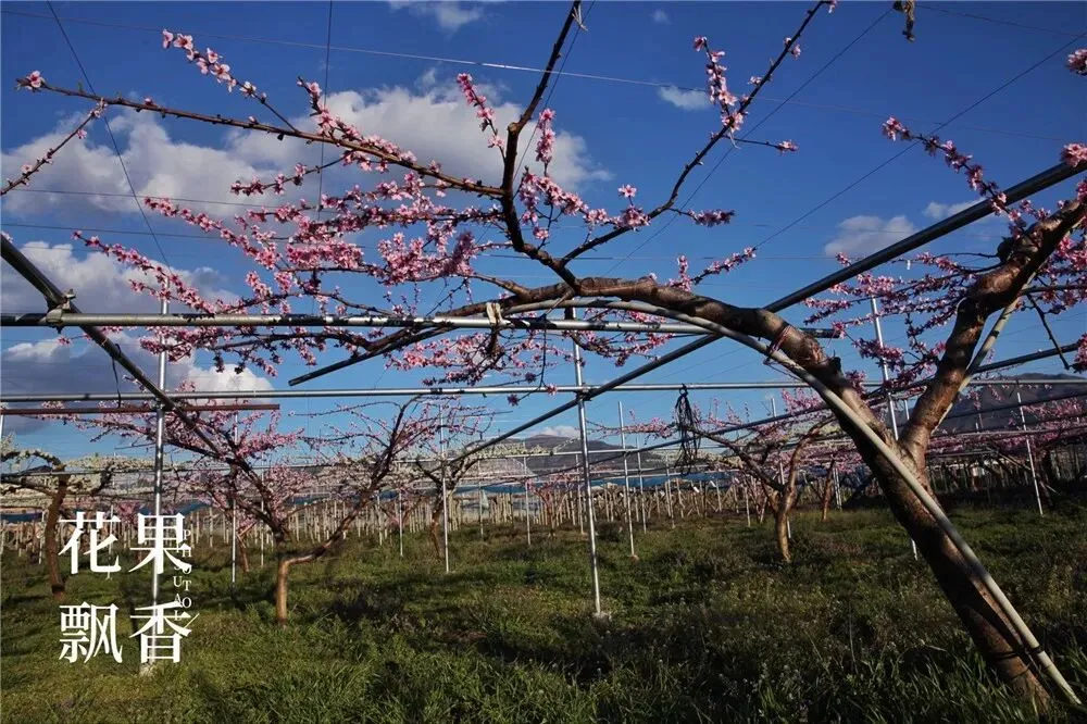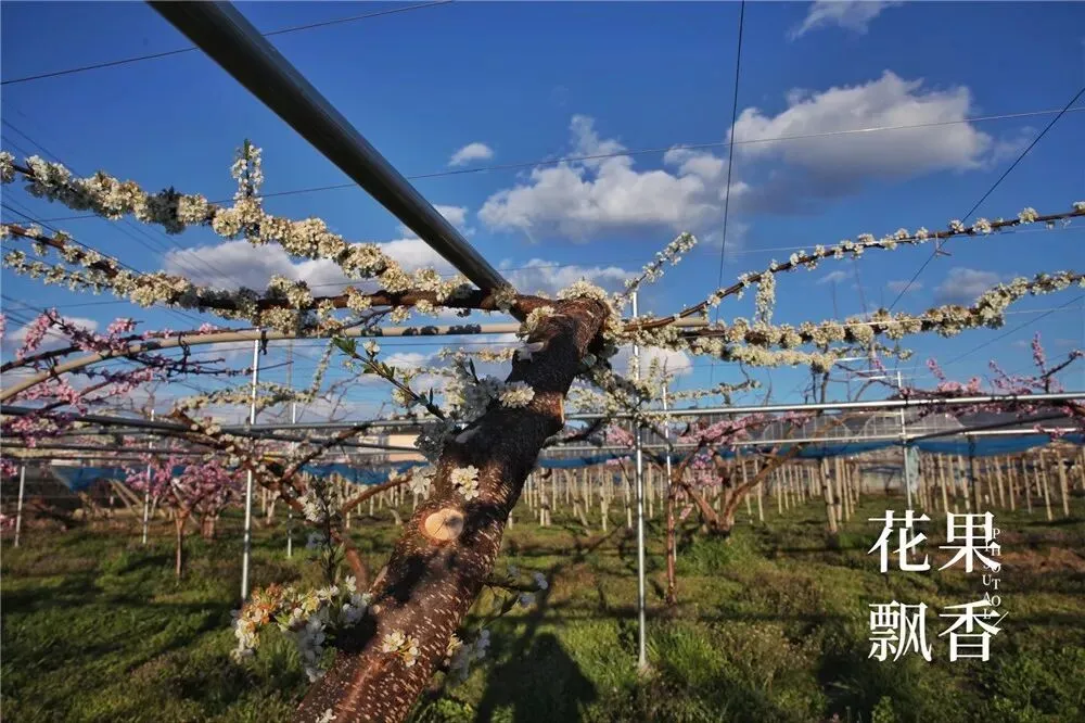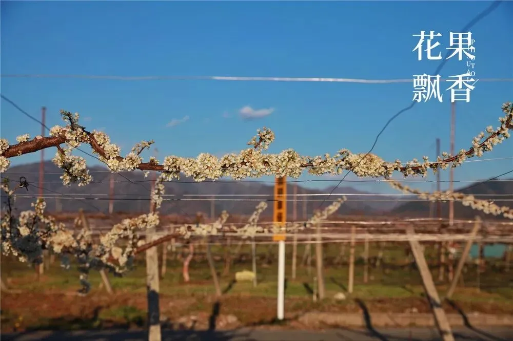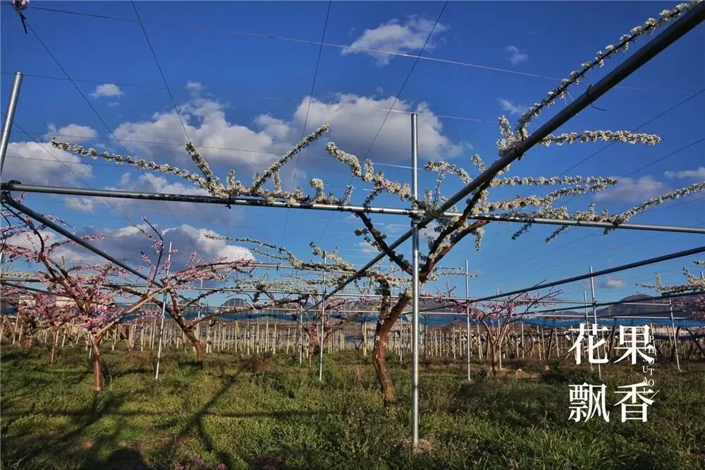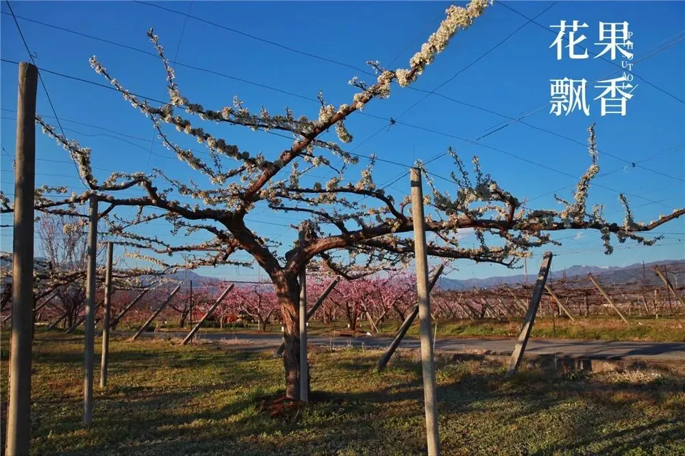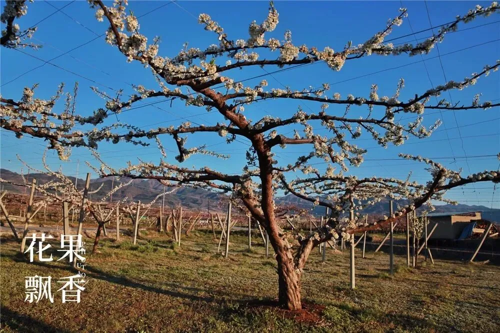 在另一块果园,盛花中的李树也是采用这种平棚架的种植模式。盛果期,高定干,三主枝。主干、主枝、侧枝、结果枝,层次分明,结构清晰,摆布均匀,令人赏心悦目。